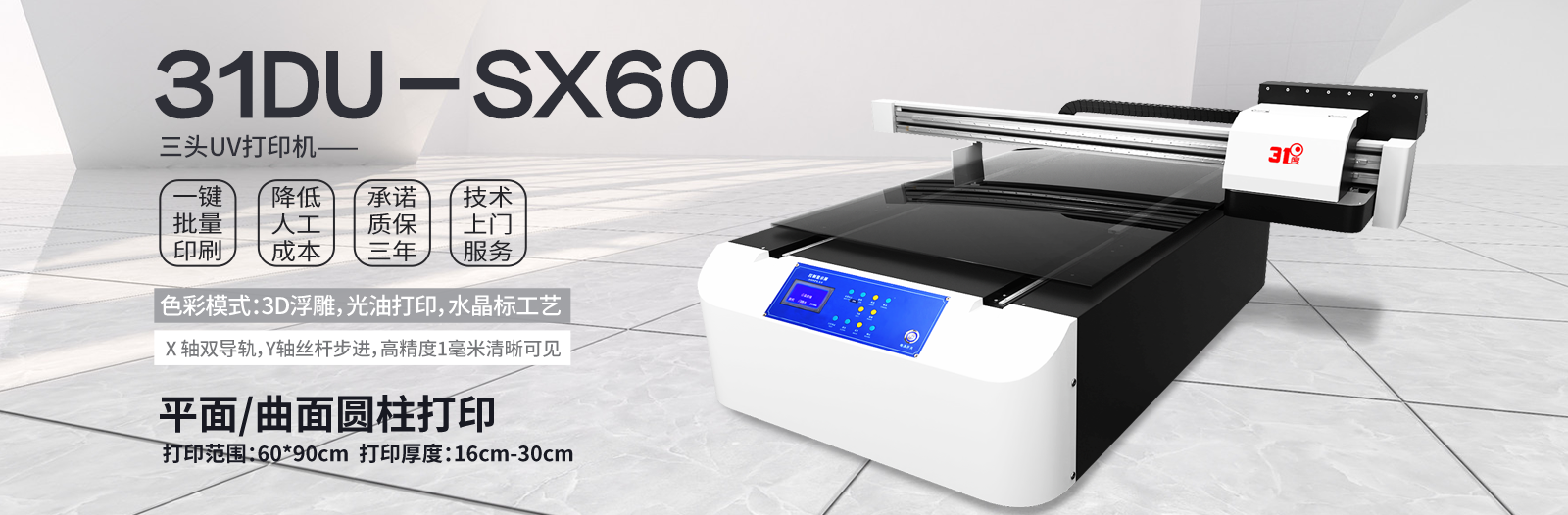 ————— 31DU-SX60 ———— 打印面积:60*90cm 厚度20cm-40cm 特点:平面圆柱都能打印,3D浮雕,高精度,配置Y轴丝杆步进X轴双导轨!直喷及转印贴双工艺